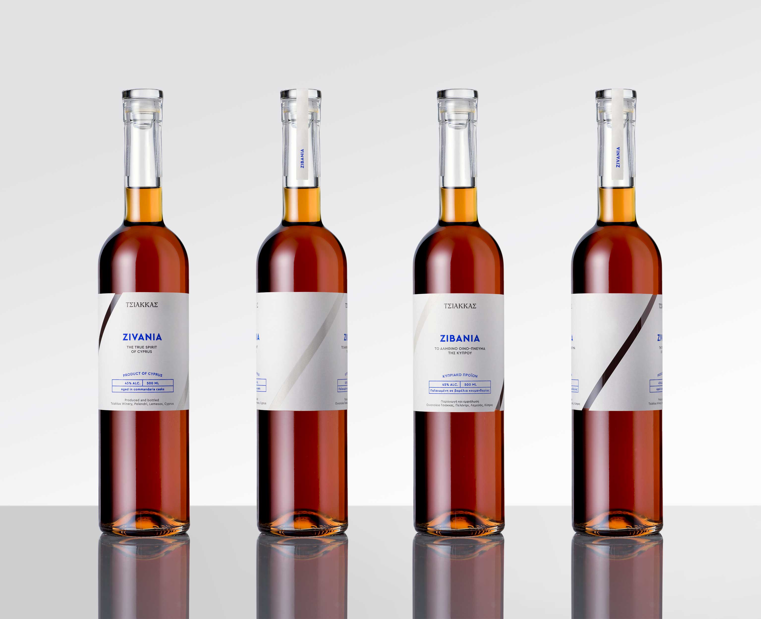 The closure of the Commandaria label forms a cross at the back of the bottle. This design element references Commandaria's use by the Orthodox Cypriot church as the only appropriate wine for the Holy Communion. A diagonal line forms on the closure of Zivania as a simplification of the letter Z and a dynamic continuum.